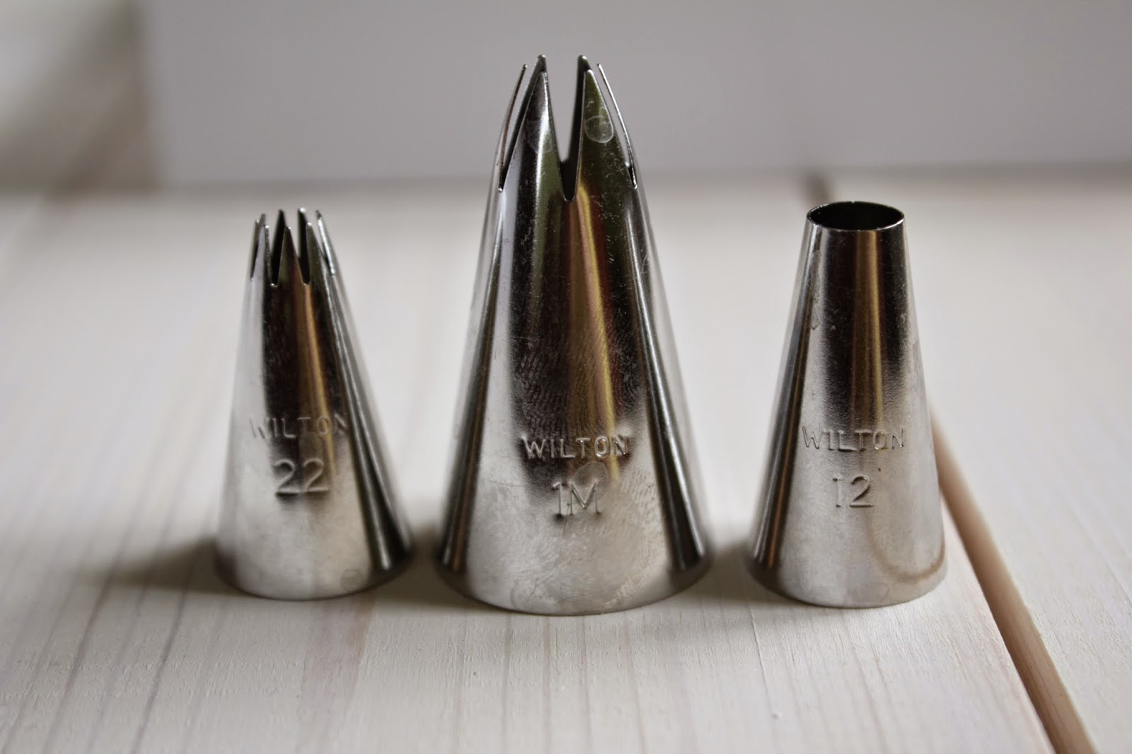 W obu wypadkach użyłam końcówki Wilton 1M (duża otwarta gwiazdka). Można użyć również innych końcówek - np. małych gwiazdek lub okrągłych, uzyskując nieco odmienne kształty.